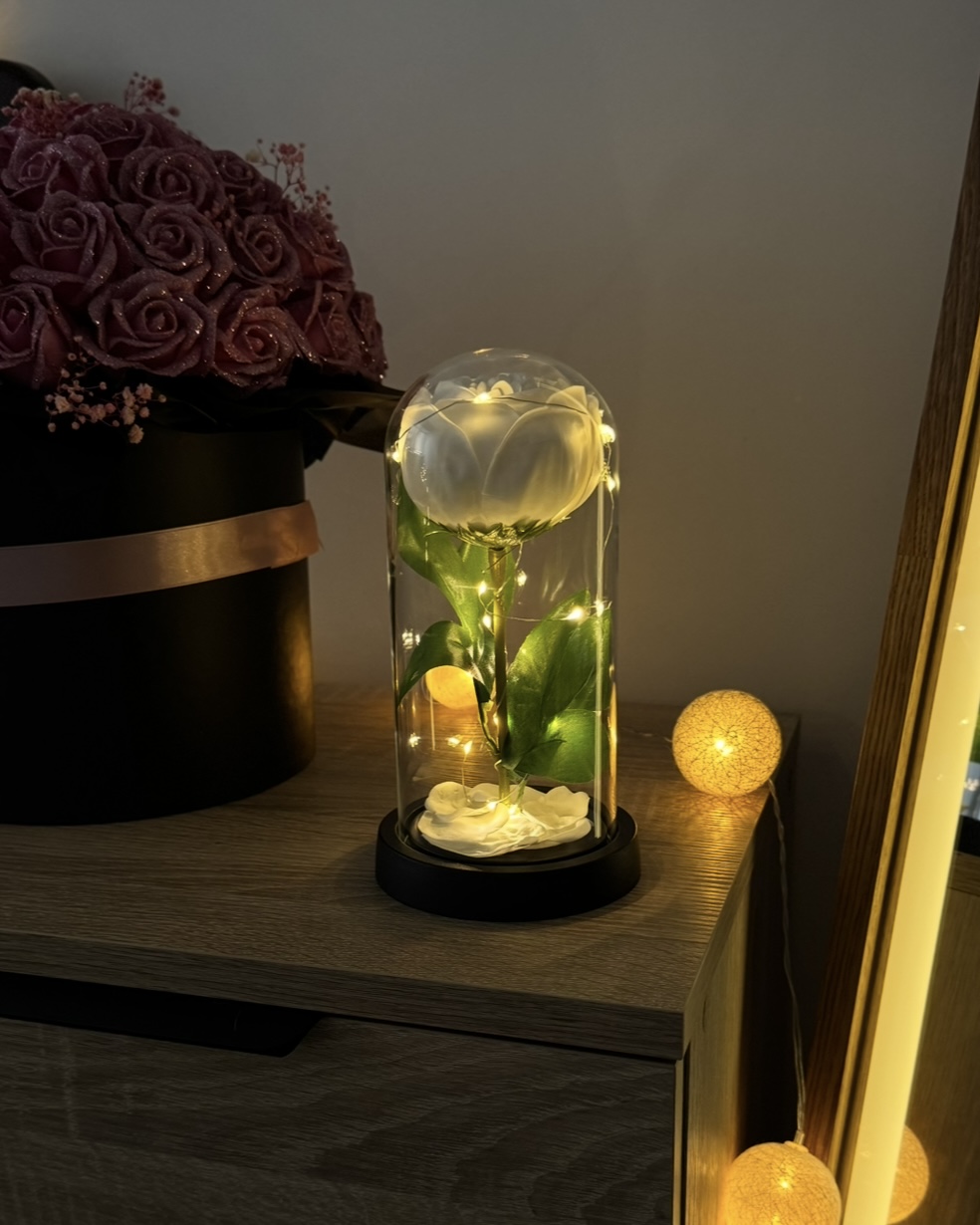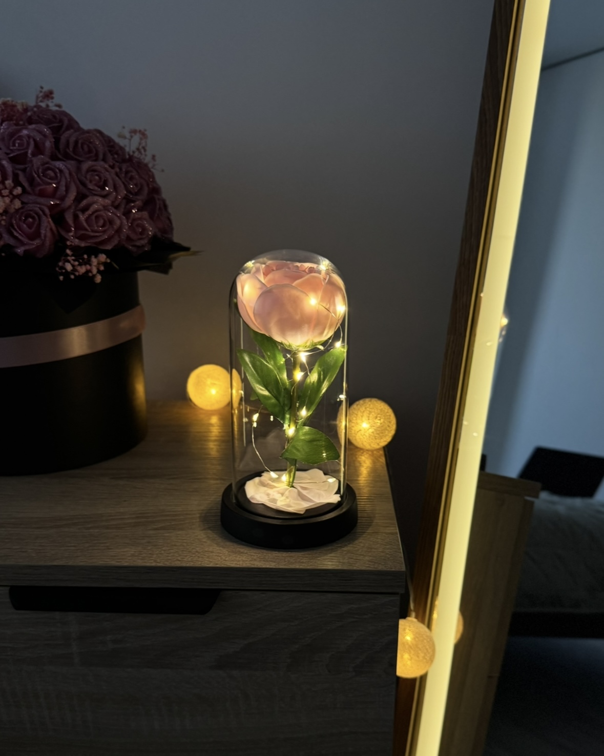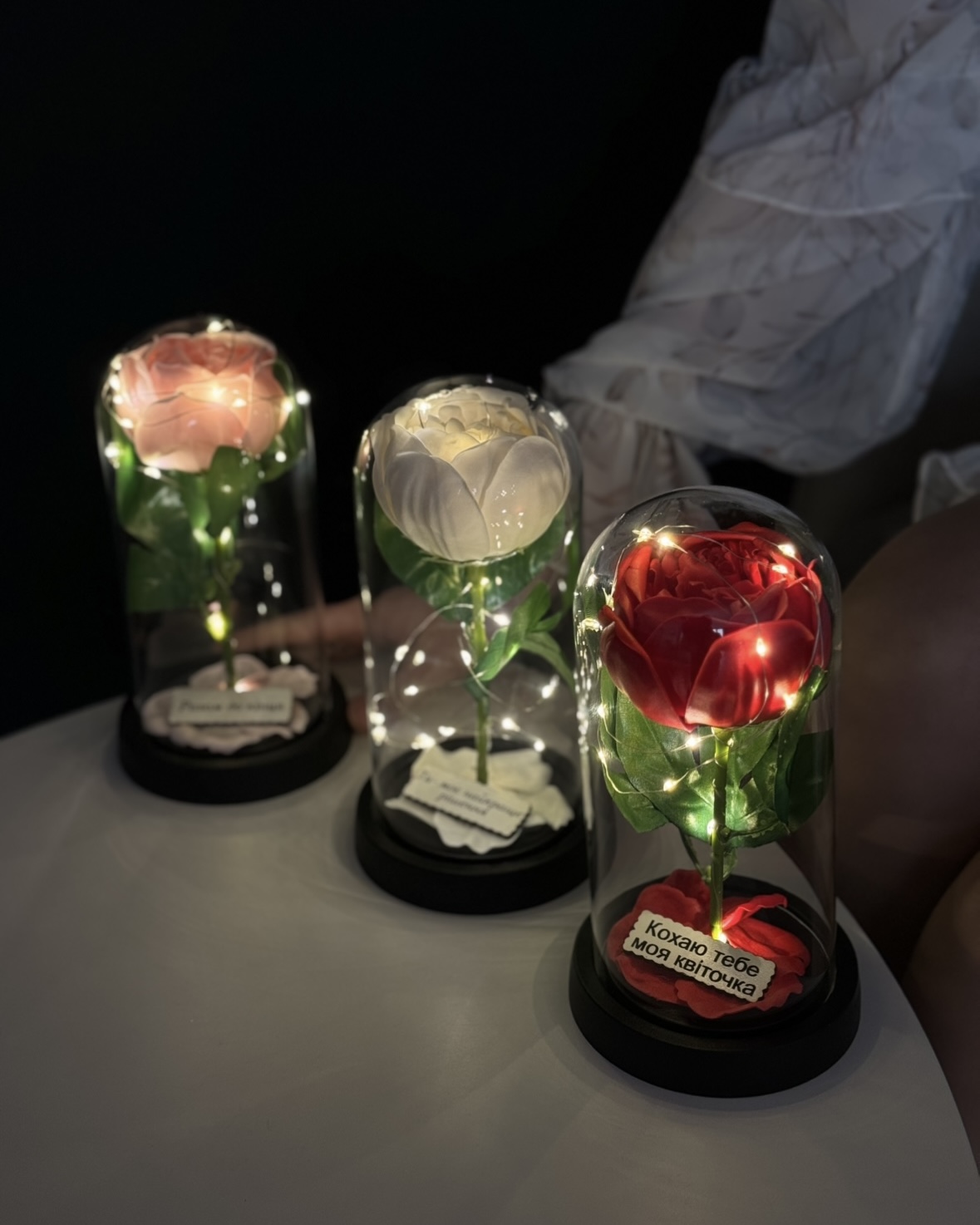 Півонія здавна вважається квіткою ніжності, краси та вірності. Вона символізує щирість у коханні та благополуччя в сім'ї. У колбі з підсвіткою ця квітка виглядає ще магічніше - ніби жива, але залишиться такою назавжди.